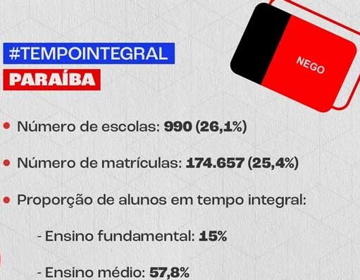 Paraíba: 57,8% das matrículas no ensino médio são em escolas integrais