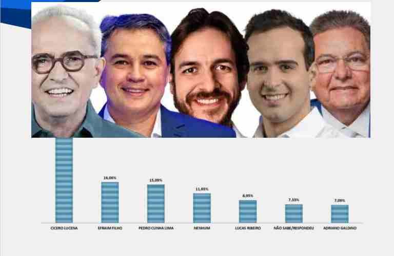 Em seguida, o senador Efraim Filho (União Brasil) tem 16,06% e o ex-deputado Pedro Cunha Lima (PSD) registra 15,09%. O vice-governador Lucas Ribeiro (PP) aparece com 8,95%; o presidente da Assembleia Legislativa, Adriano Galdino (Republicanos) soma 7,09%.